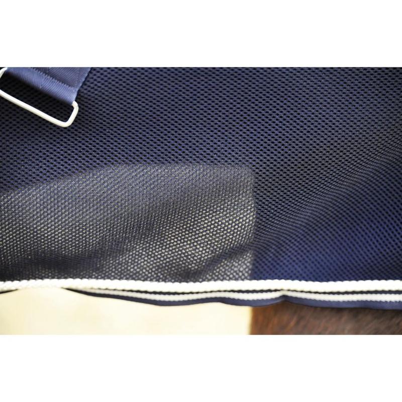 siateczkowa tkanina materiału AirDry 3D zapewniająca olbrzymie zwiększenie powierzchni w celu przyspieszenia parowania, z dzianiną 3D tworzącą poduszkę powietrzną wokół konia chroniącą zwierzę przed wychłodzeniem i przeciągiem, bez efektu przegrzania