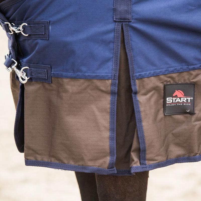 Derka padokowa Start 2-tone bez wypełnienia. Wykonana z oddychającego i wodoodpornego materiału, podszyta od wewnątrz polarem. Derka posiada klapę na ogon, pasy krzyżowe zapobiegające przesuwaniu się derki oraz rozcięcie na łopatkach zapewniające swobodę ruchów. Ozdobiona logiem producenta.