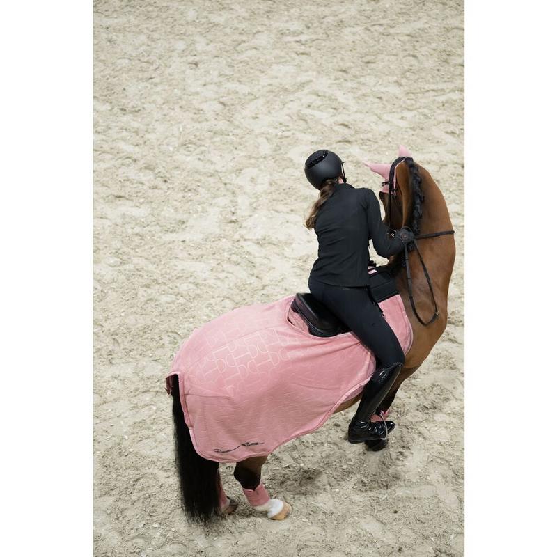 Derka polarowa z kolekcji Eskadron Platinum 2025. Wykonana z wysokiej jakości dzianiny polarowej z efektem antypillingu. Ozdobiona błyszczącym wypełnieniem w okolicy kłębu, platynowym haftem na karku po obu stronach i efektonym tłoczeniem na całej powierzchni. Derka wyposażona została w podwójne zapięcie na piersi z mocowaniem na rzep, odpinane pasy krzyżowe oraz zintegrowany pasek na ogon.
