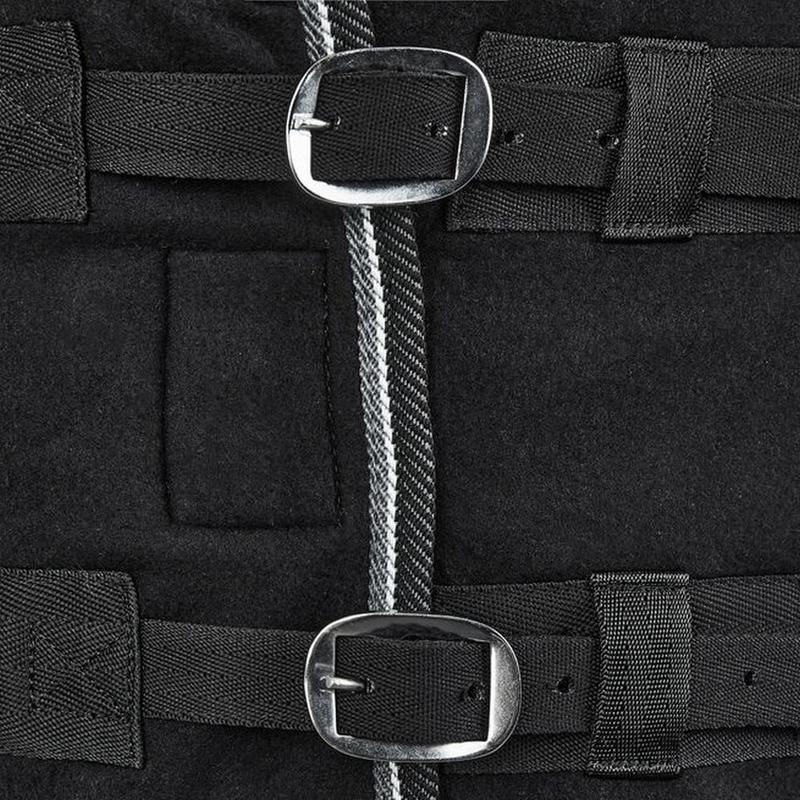 Derka polarowa firmy Horze. Uszyta z miękkiego polaru. Idealnie odprowadza wilgoć. Wyposażona w dwie sprzączki, rzepy z przodu, pasy krzyżowe i pasek pod ogon, który utrzymuje derkę na miejscu. Ozdobiona atrakcyjną lamówką.