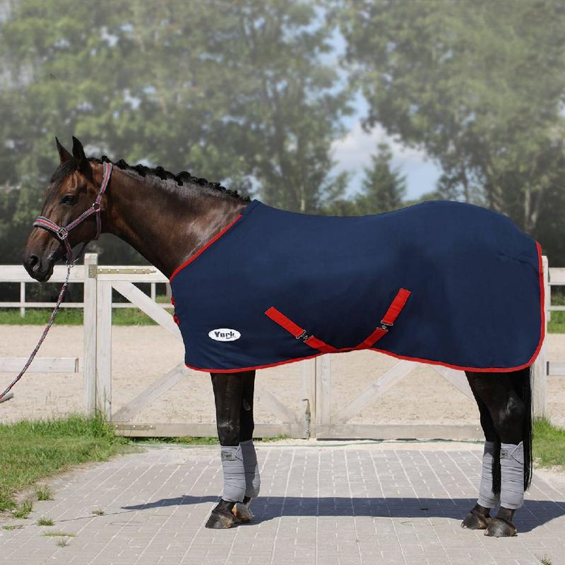 Derka polarowa firmy York. Z przodu zapinana na dwie klamry, w okolicy ogona posiada sznurek. Posiada lamówkę i wstawki w kontrastowy kolorze. Bez pasów pod brzuchem.