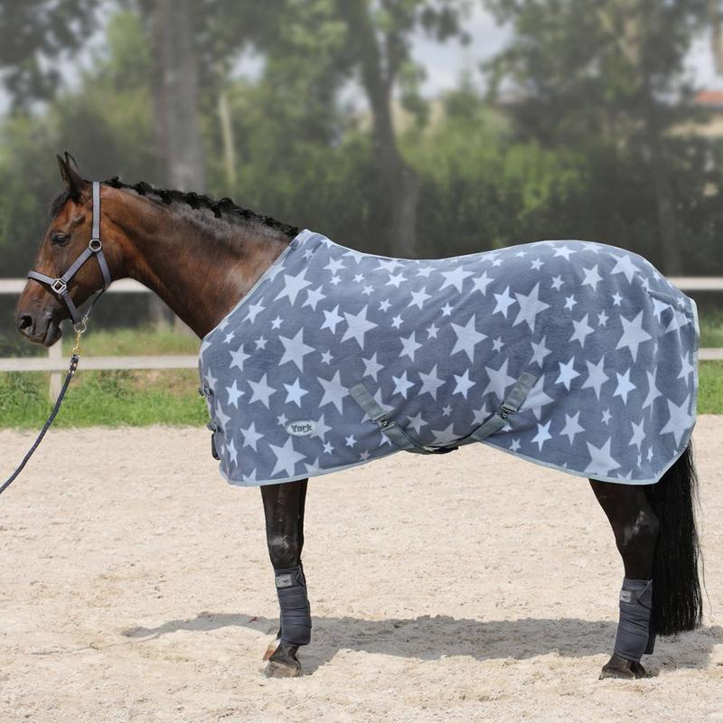 Derka zdobiona gwiazdkami firmy York. Wykonana z bardzo przyjemnego w dotyku polaru. Zapinana z przodu na dwie sprzączki. Posiada pasy krzyżowe pod brzuchem oraz sznur w okolicy ogona.