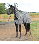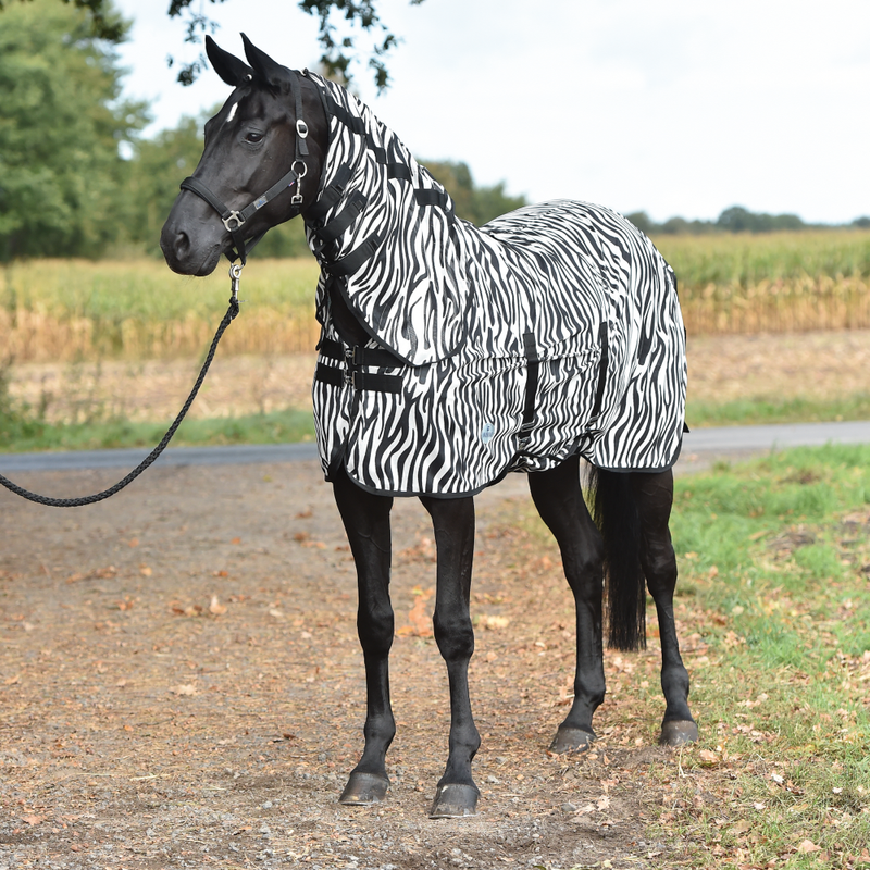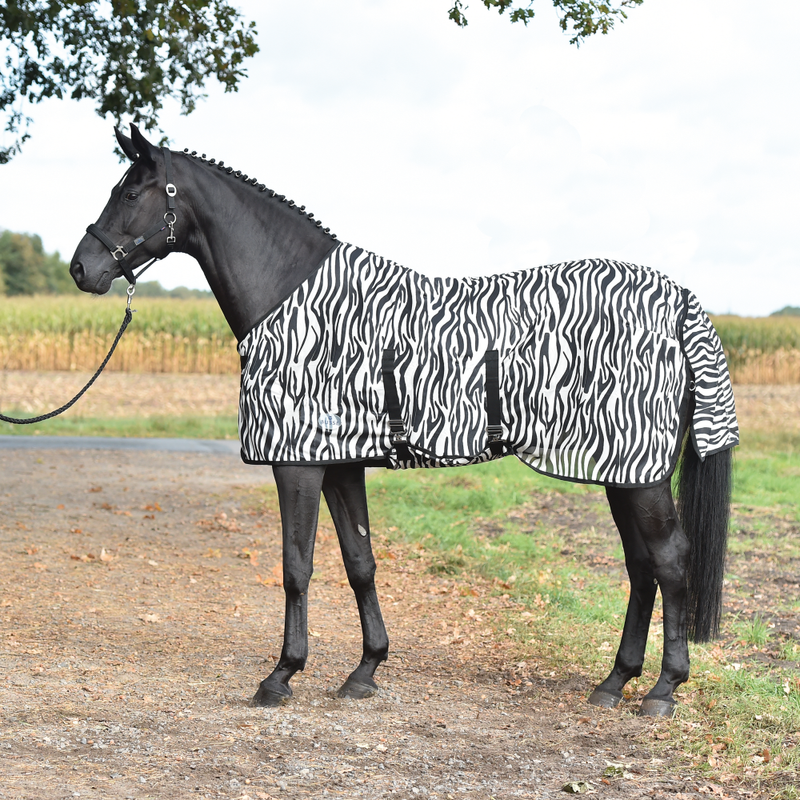 Derka chroniąca przed muchami, komarami i gzami podczas pobytu konia w stajni, na pastwisku i na padoku firmy Busse. Dodatkowo czarno-biały wzór w naturalny sposób chroni przed owadami; potwierdzono naukowo, że dzięki temu wzorowi konie przestają być cele