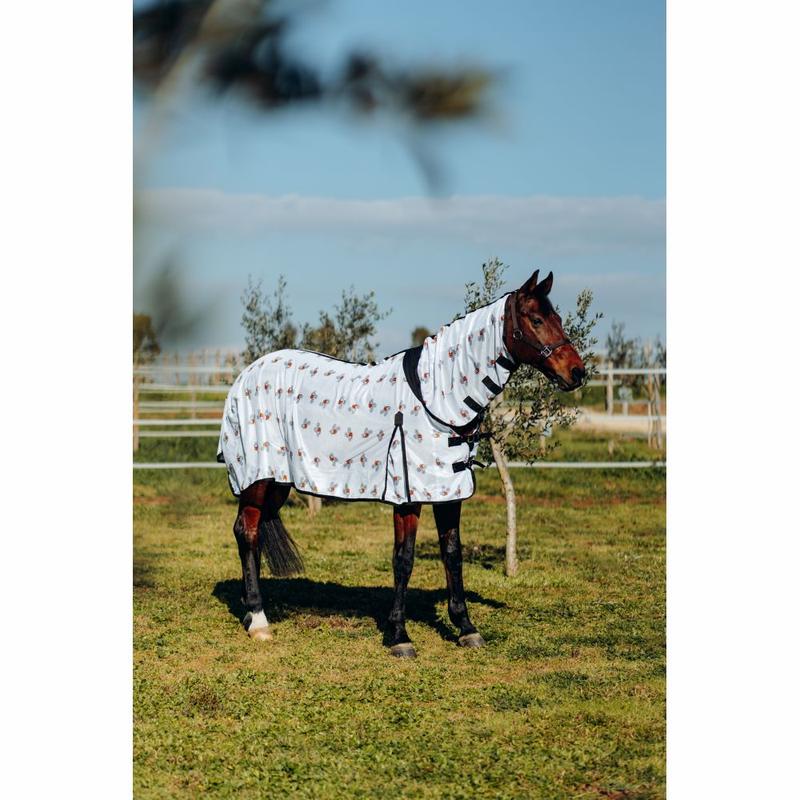 Derka firmy Horze, produkt limitowany. Ochroni konia przed owadami i zapewni przyjemny chłód na zawodach, w stajni lub poza nią. 100% poliester.Prać w temp. 40 stopni.Nie suszyć w suszarce.