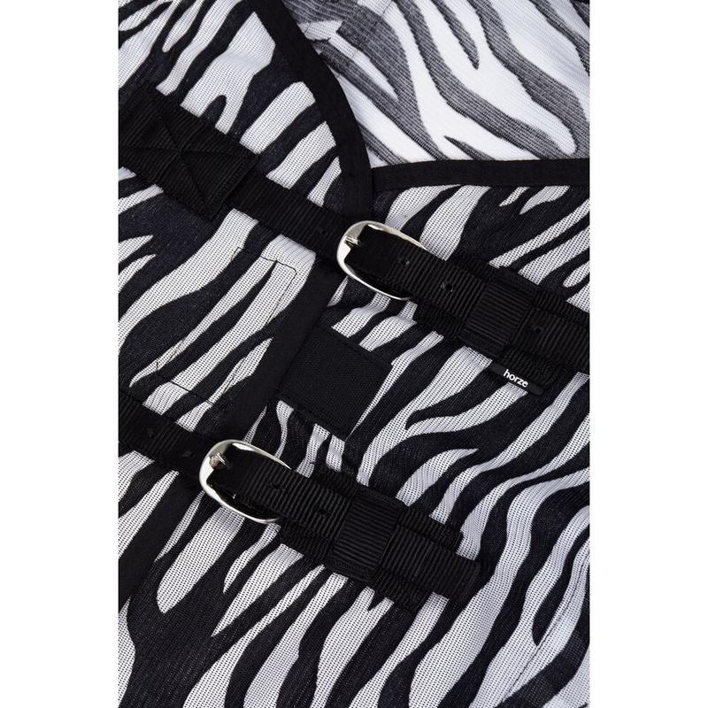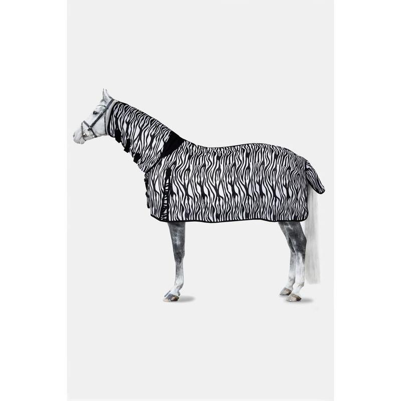 Derka siatkowa, przeciw muchom Zebra z kapturem firmy HKM. Charakterystyczny nadruk „zebry” redukuje przyciąganie much. Derka wykonana z bardzo trwałego materiału, odpornego na przetarcie. Wyposażona w regulowane zapięcia z przodu, paski krzyżowe pod brz