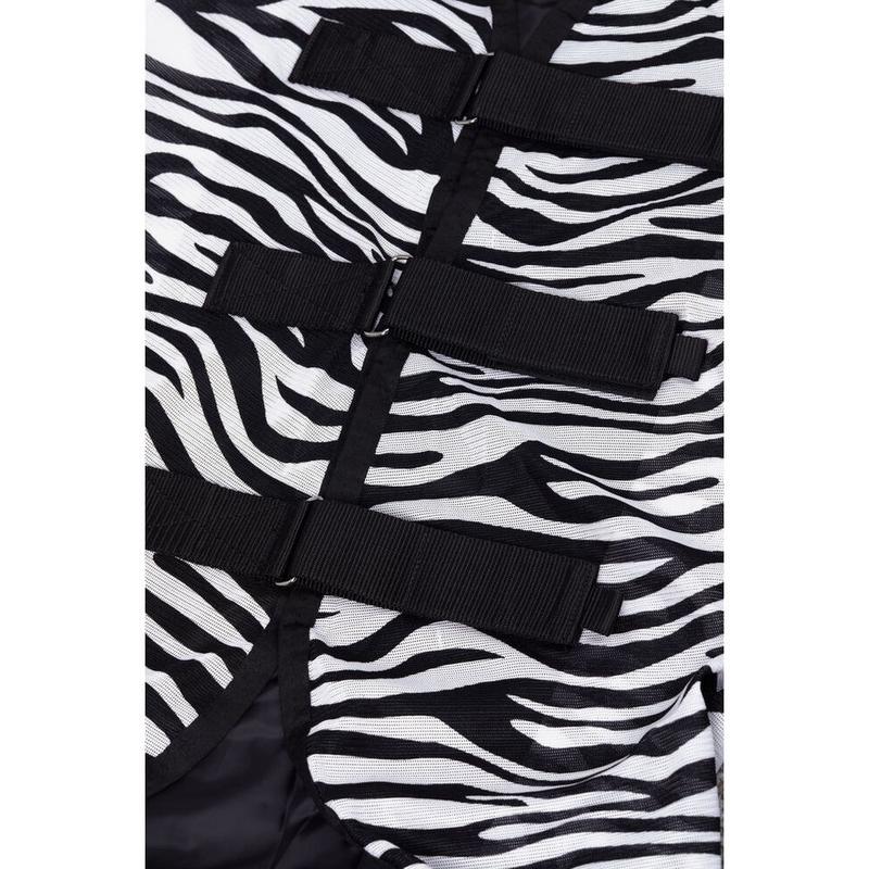 Derka siatkowa, przeciw muchom Zebra firmy HKM. Charakterystyczny nadruk „zebry” redukuje przyciąganie much. Derka wykonana z bardzo trwałego materiału, odpornego na przetarcie. Wyposażona w regulowane zapięcia z przodu, paski krzyżowe pod brzuchem oraz