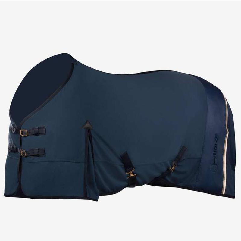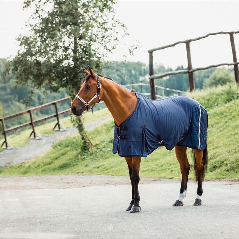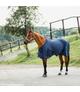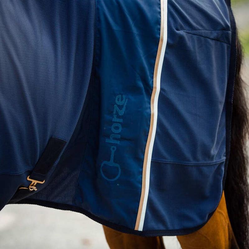 Derka siatkowa Horze Defender z kapturem posiadająca długi kaptur z zapięciem na rzep i możliwością przymocowania maski przeciwko owadom (maska nie jest dostępna w zestawie).