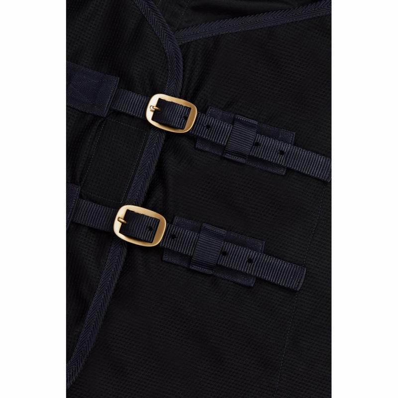 Derka firmy Busse, wykonana z siatki poliestrowej bardzo odporna na zabrudzenia i wilgoć. Optymalne dopasowanie dzięki zastosowaniu szwu na grzbiecie, regulowane zapięcie pod brzuchem w formie pasów krzyżowych, z przodu zapinana na klamrę z dodatkowym zapięciem na rzep.