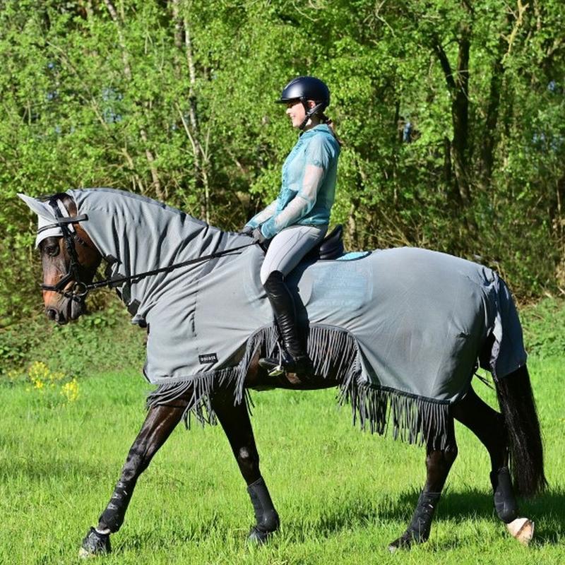 Siatkowa derka treningowa firmy Busse ze zdejmowanym kapturem i wycięciem na siodło. Wykonana z oddychającego materiału odprowadzajacego wilgoć. Idelana osłaona przed owadami.