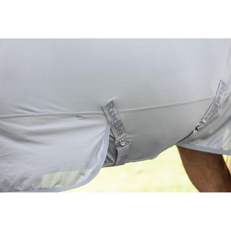 Derka firmy Busse, wykonana z siatki poliestrowej bardzo odporna na zabrudzenia i wilgoć. Optymalne dopasowanie dzięki zastosowaniu szwu na grzbiecie, regulowane zapięcie pod brzuchem w formie pasów krzyżowych, z przodu zapinana na klamrę z dodatkowym zapięciem na rzep.