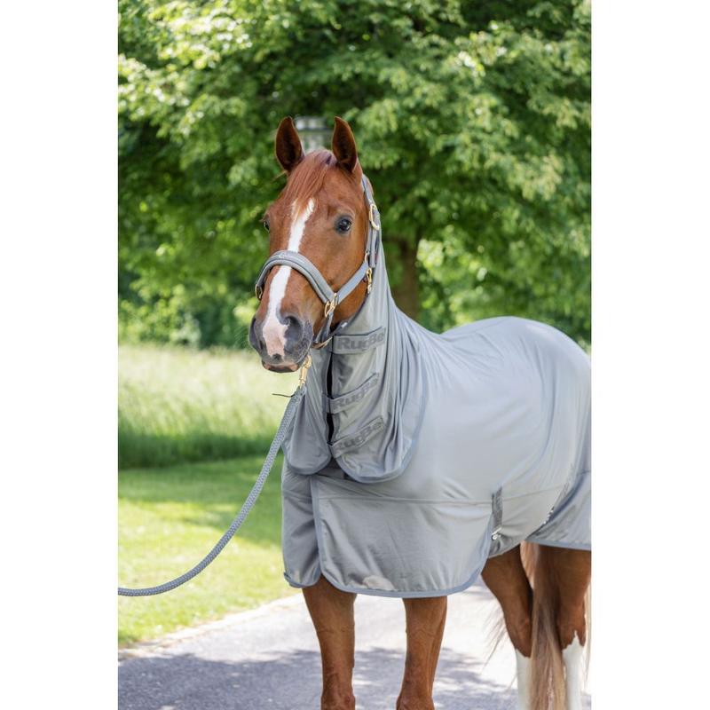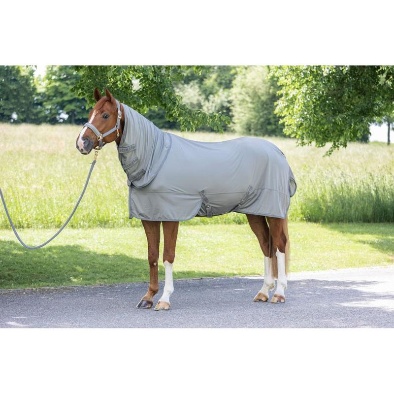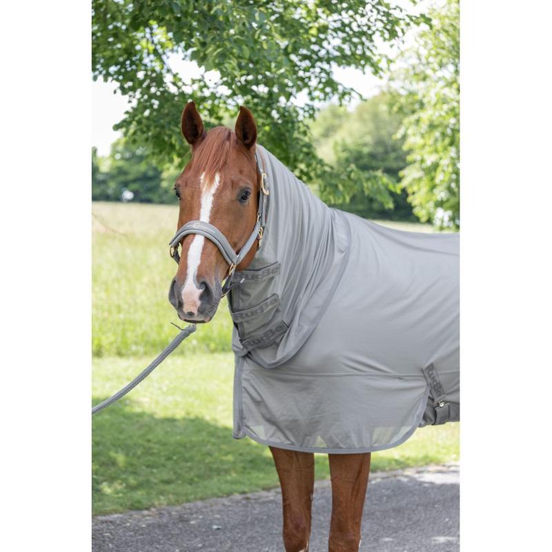 Siatkowa derka treningowa firmy Busse ze zdejmowanym kapturem i wycięciem na siodło. Wykonana z oddychającego materiału odprowadzajacego wilgoć. Idelana osłaona przed owadami.
