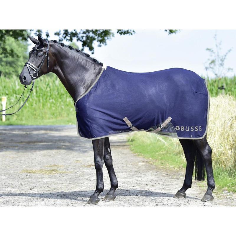 Derka firmy Busse, wykonana z siatki poliestrowej bardzo odporna na zabrudzenia i wilgoć. Optymalne dopasowanie dzięki zastosowaniu szwu na grzbiecie, regulowane zapięcie pod brzuchem w formie pasów krzyżowych, z przodu zapinana na klamrę z dodatkowym zapięciem na rzep.
