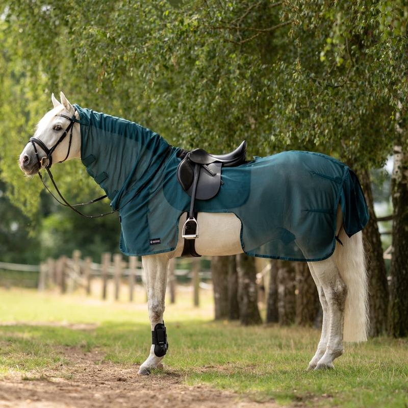 Siatkowa derka treningowa firmy Busse ze zdejmowanym kapturem i wycięciem na siodło. Wykonana z oddychającego materiału odprowadzajacego wilgoć. Idelana osłaona przed owadami.