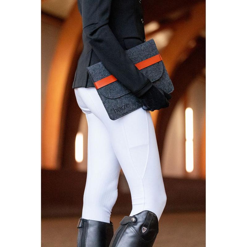 Etui na paszport Equine firmy Horze to elegancki sposób na bezpieczne przechowywanie paszportu konia. Klapka ma zapięcie na elastyczny pasek w kolorach marki, dzięki czemu paszport nie wysunie się ze środka. Mały detal z logo w lewym rogu.