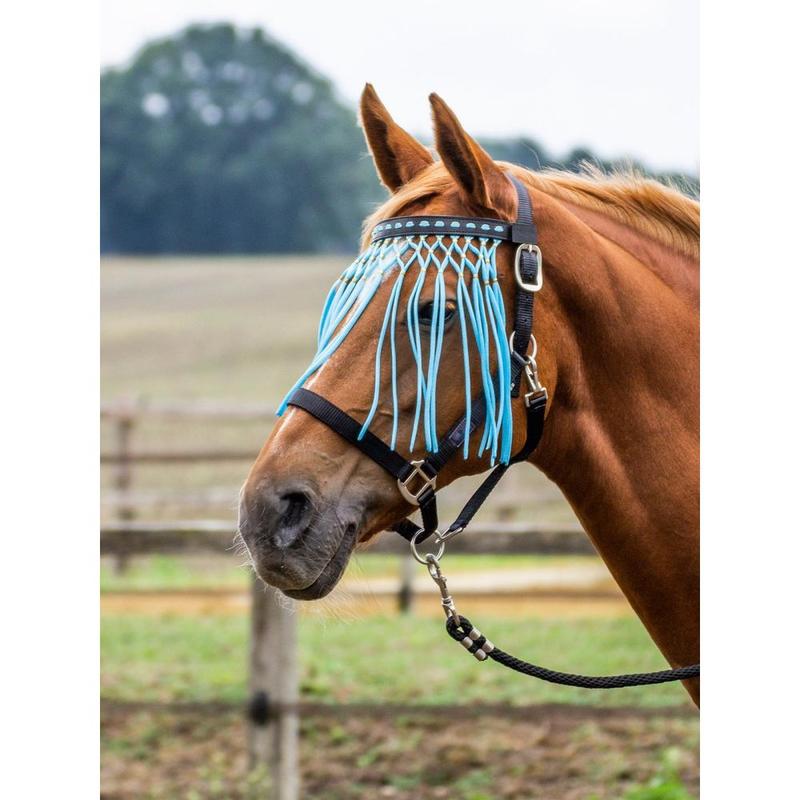 Frędzle firmy Busse. Naczółek wykonany ze skóry, frędzle nylonowe, mocowane na rzepy, frędzle w górnej części połączone elegancko w siateczkę Długość naczółka regulowana: 38 - 43 cm, długość frędzli: 22 - 28 cm