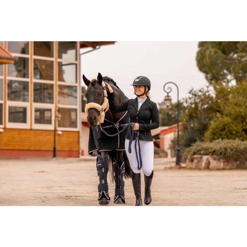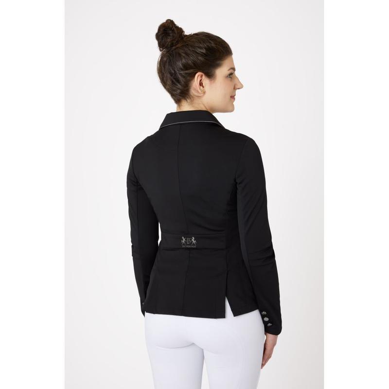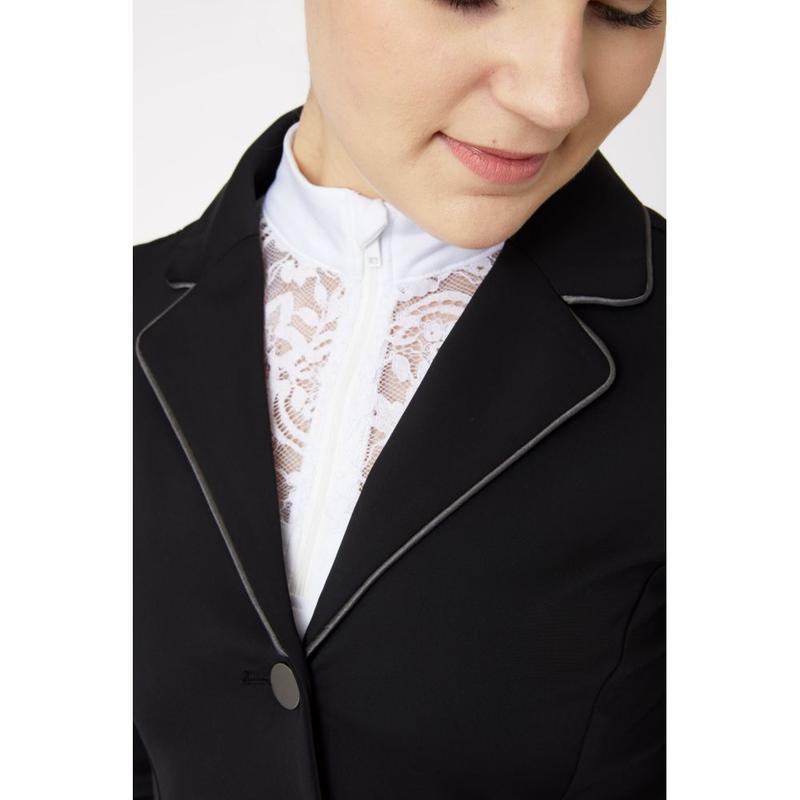 Elegancki klasycznie skrojony frak ujeżdżeniowy z kolekcji wiosna-lato 2025. Z cyrkoniowymi aplikacjami. Fraczek zapinany dodatkowo na zamek. Wykonany z materiału Tech-Jersey.Tkanina siateczkowa na bokach i pod pachami. Podszewka: przepuszczająca powietrze tkanina siateczkowa. Aplikacja z kryształków olimpijskich na kołnierzu, pasie i krawędziach....