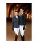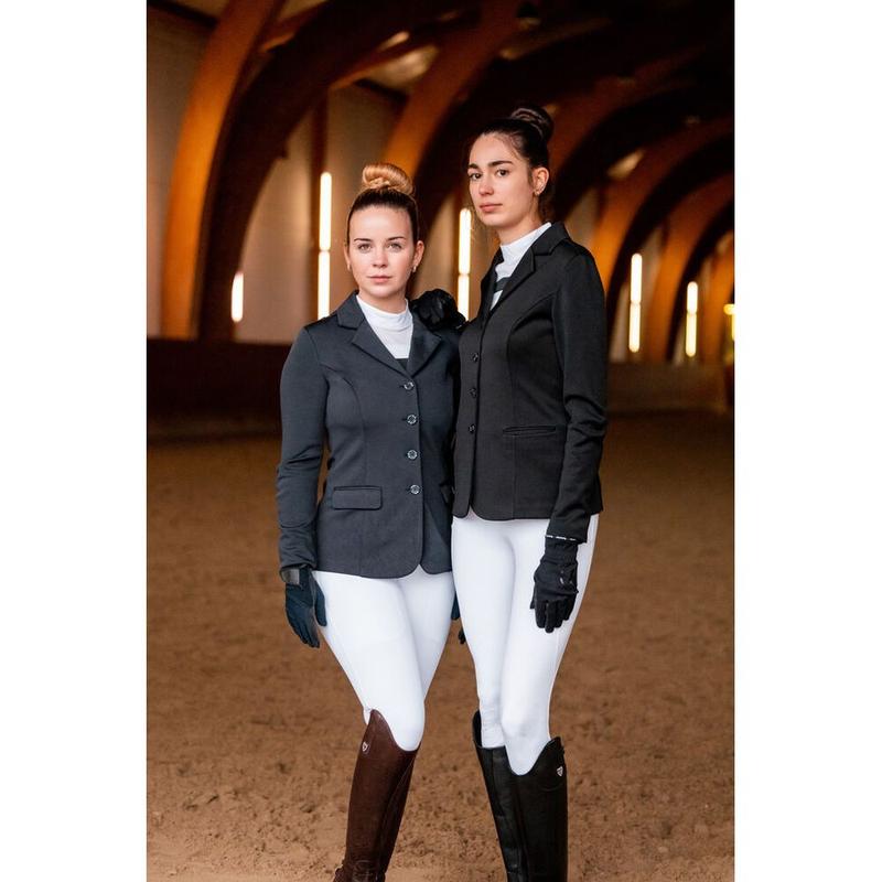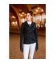 Frak damski firmy Horze. Uszyty z miękkiego w dotyku, wygodnego rozciągliwego materiału z domieszką elastanu. Klasyczny, ponadczasowy fason zapinany na guziki wykończone małymi kryształkami. Posiada dwie kieszenie z patką, mankiety na guziki oraz metalowe logo Horze na kieszeni.