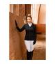 Frak damski firmy Horze. Uszyty z miękkiego w dotyku, wygodnego rozciągliwego materiału z domieszką elastanu. Klasyczny, ponadczasowy fason zapinany na guziki wykończone małymi kryształkami. Posiada dwie kieszenie z patką, mankiety na guziki oraz metalowe logo Horze na kieszeni.