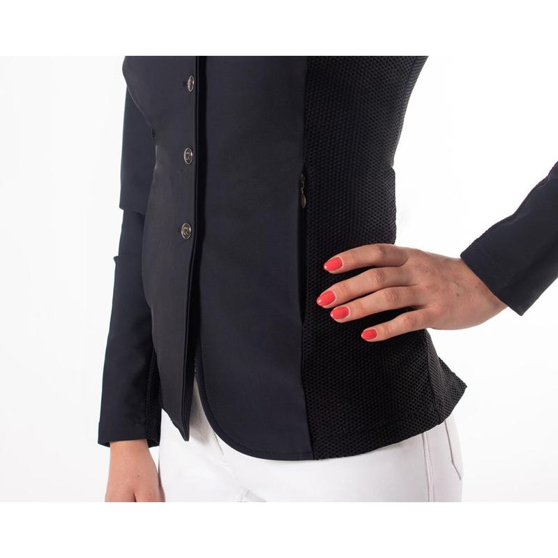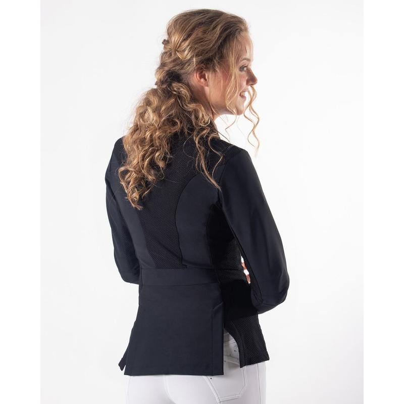Frak damski firmy QHP. Oddychający frak wykonany z softshellu, posiada wstawki z siatki dla lepszej wentylacji. Świetnie nadaje się na zawody w ciągu lata, ze względu na oddychający materiał. Zapinany na guzik oraz ukryty zamek. Z przodu posiada ukryty zamek błyskawiczny.