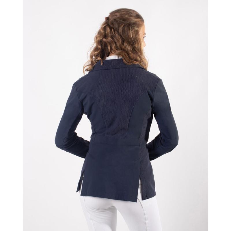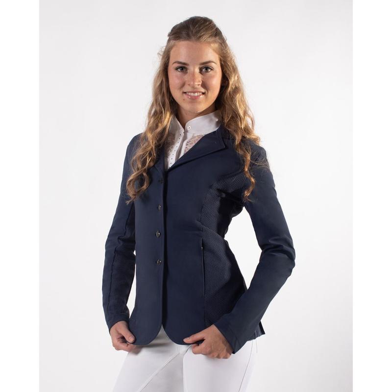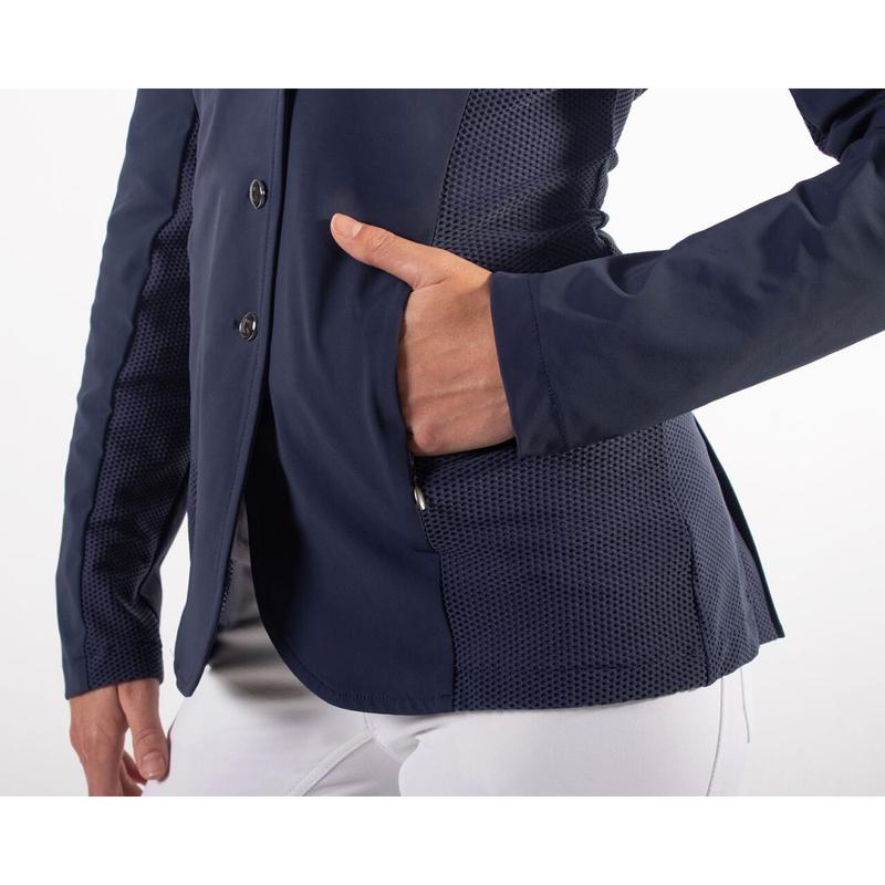 Frak damski firmy QHP. Oddychający frak wykonany z softshellu, posiada wstawki z siatki dla lepszej wentylacji. Świetnie nadaje się na zawody w ciągu lata, ze względu na oddychający materiał. Zapinany na guzik oraz ukryty zamek. Z przodu posiada ukryty zamek błyskawiczny.