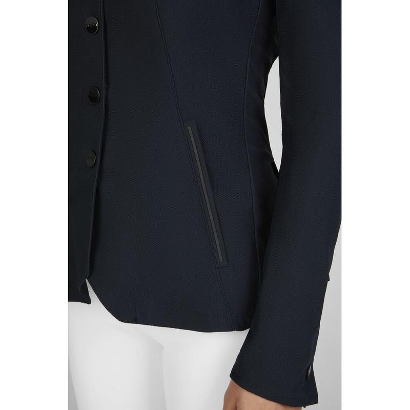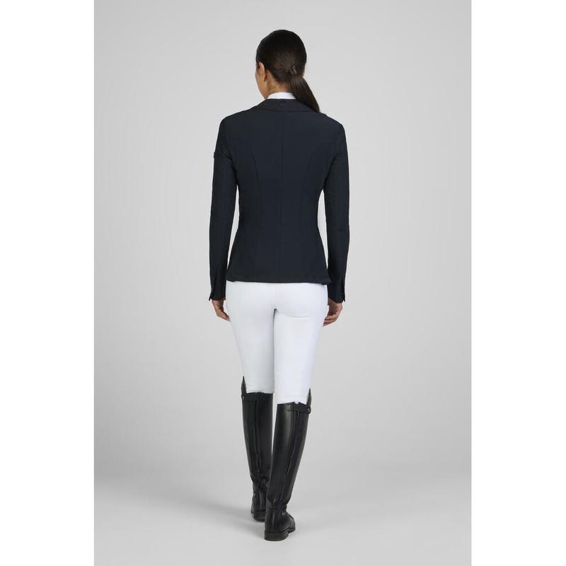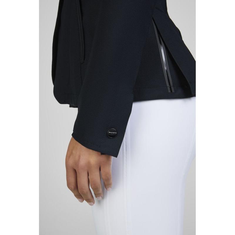 Elegancki klasycznie skrojony frak ujeżdżeniowy z kolekcji wiosna-lato 2025. Z cyrkoniowymi aplikacjami. Fraczek zapinany dodatkowo na zamek. Wykonany z materiału Tech-Jersey.Tkanina siateczkowa na bokach i pod pachami. Podszewka: przepuszczająca powietrze tkanina siateczkowa. Aplikacja z kryształków olimpijskich na kołnierzu, pasie i krawędziach....