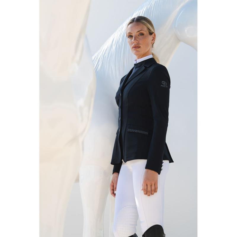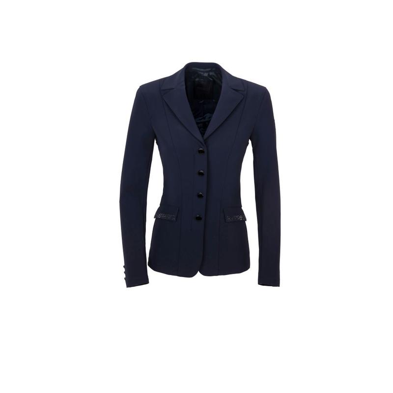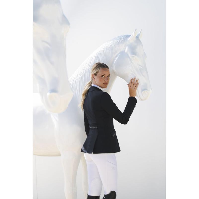Elegancki klasycznie skrojony frak ujeżdżeniowy z kolekcji wiosna-lato 2025. Z cyrkoniowymi aplikacjami. Fraczek zapinany dodatkowo na zamek. Wykonany z materiału Tech-Jersey.Tkanina siateczkowa na bokach i pod pachami. Podszewka: przepuszczająca powietrze tkanina siateczkowa. Aplikacja z kryształków olimpijskich na kołnierzu, pasie i krawędziach....