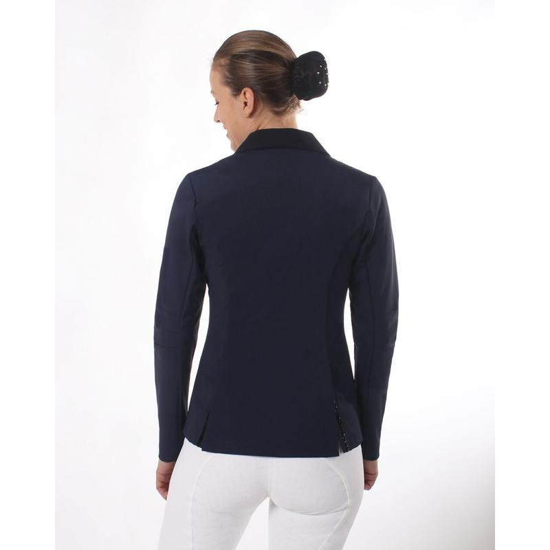 Frak młodzieżowy Zayla firmy Horze. Wykonany z elastycznego, lekkiego, oddychającego letniego materiału. Zapinany na trzy guziki i ozdobiony kryształowymi detalami na kieszeniach.Matreiał: 12% Nylon 85% Rayon 3% Elastan.
