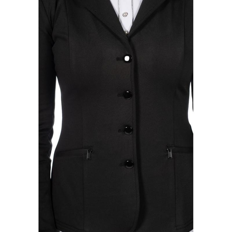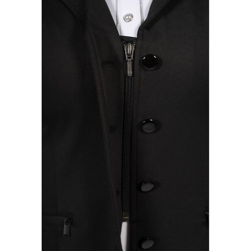 Frak firmy HKM. Wykonany z elastycznego, oddychającego oraz przyjemnego w dotyku materiału rozciągliwego w 4 kierunkach. Posiada dwie kieszonki zewnętrzne i rozcięcie w tylnej części. Wyposażony w ukryty suwak pod listwą z guzikami.