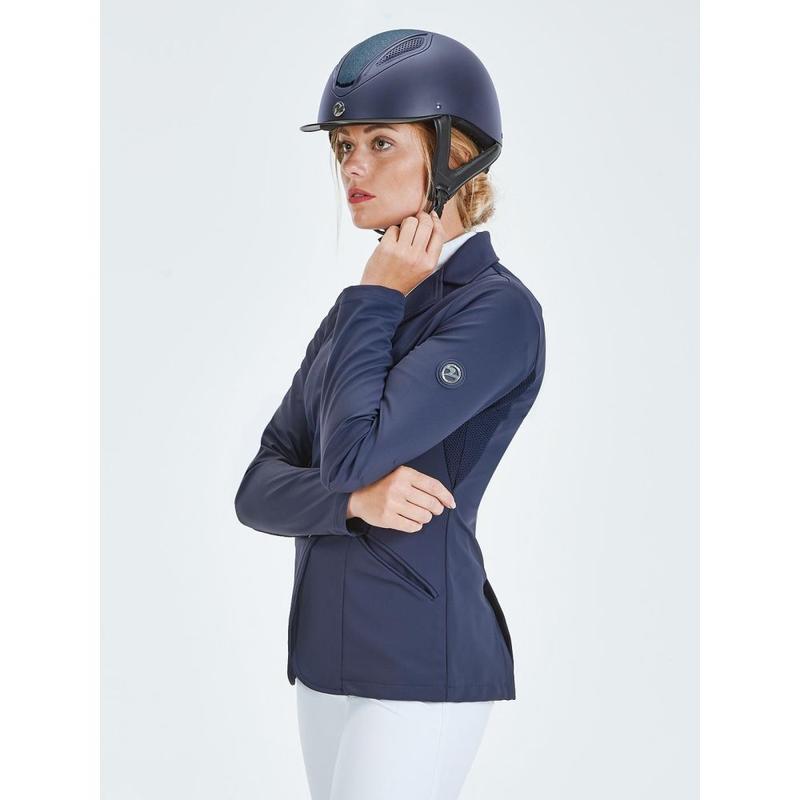 Elegancki klasycznie skrojony frak ujeżdżeniowy z kolekcji wiosna-lato 2025. Z cyrkoniowymi aplikacjami. Fraczek zapinany dodatkowo na zamek. Wykonany z materiału Tech-Jersey.Tkanina siateczkowa na bokach i pod pachami. Podszewka: przepuszczająca powietrze tkanina siateczkowa. Aplikacja z kryształków olimpijskich na kołnierzu, pasie i krawędziach....