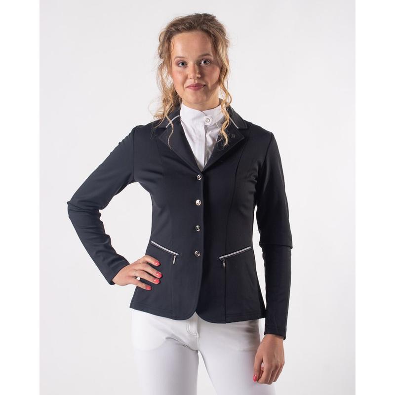 Frak młodzieżowy Zayla firmy Horze. Wykonany z elastycznego, lekkiego, oddychającego letniego materiału. Zapinany na trzy guziki i ozdobiony kryształowymi detalami na kieszeniach.Matreiał: 12% Nylon 85% Rayon 3% Elastan.