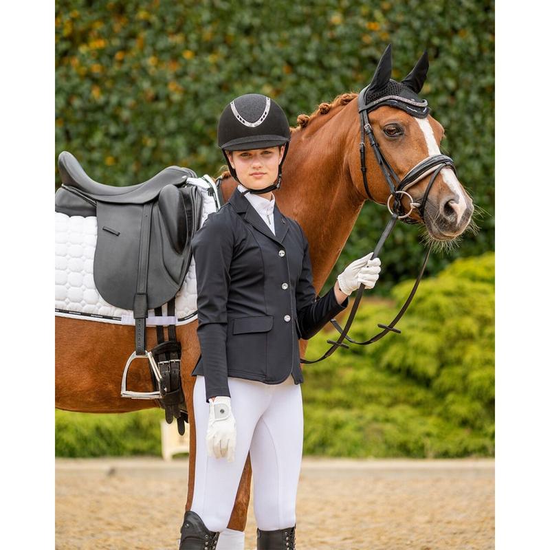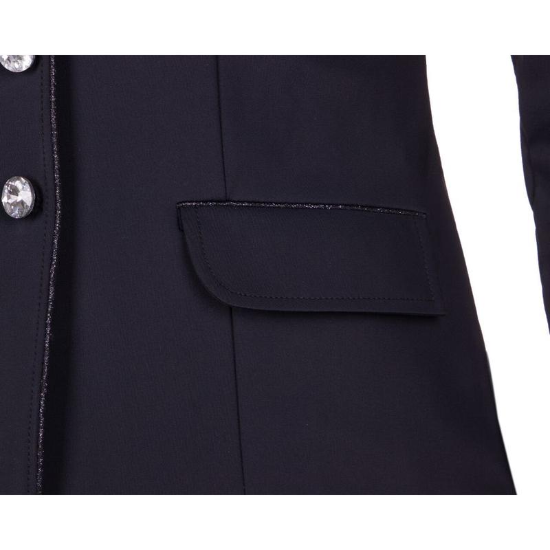Frak młodzieżowy Zayla firmy Horze. Wykonany z elastycznego, lekkiego, oddychającego letniego materiału. Zapinany na trzy guziki i ozdobiony kryształowymi detalami na kieszeniach.Matreiał: 12% Nylon 85% Rayon 3% Elastan.