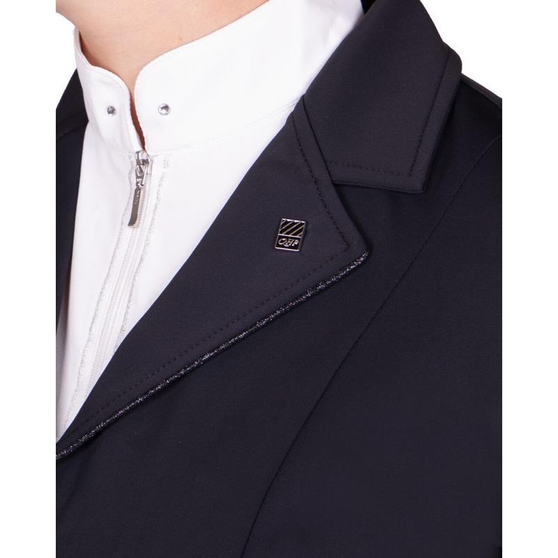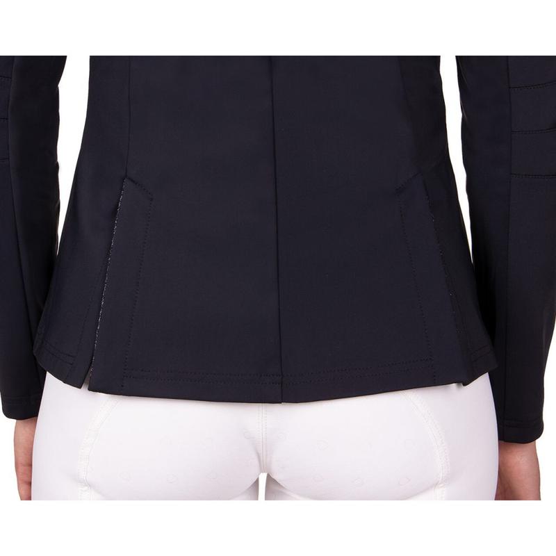 Elegancki klasycznie skrojony frak ujeżdżeniowy z kolekcji wiosna-lato 2025. Z cyrkoniowymi aplikacjami. Fraczek zapinany dodatkowo na zamek. Wykonany z materiału Tech-Jersey.Tkanina siateczkowa na bokach i pod pachami. Podszewka: przepuszczająca powietrze tkanina siateczkowa. Aplikacja z kryształków olimpijskich na kołnierzu, pasie i krawędziach....
