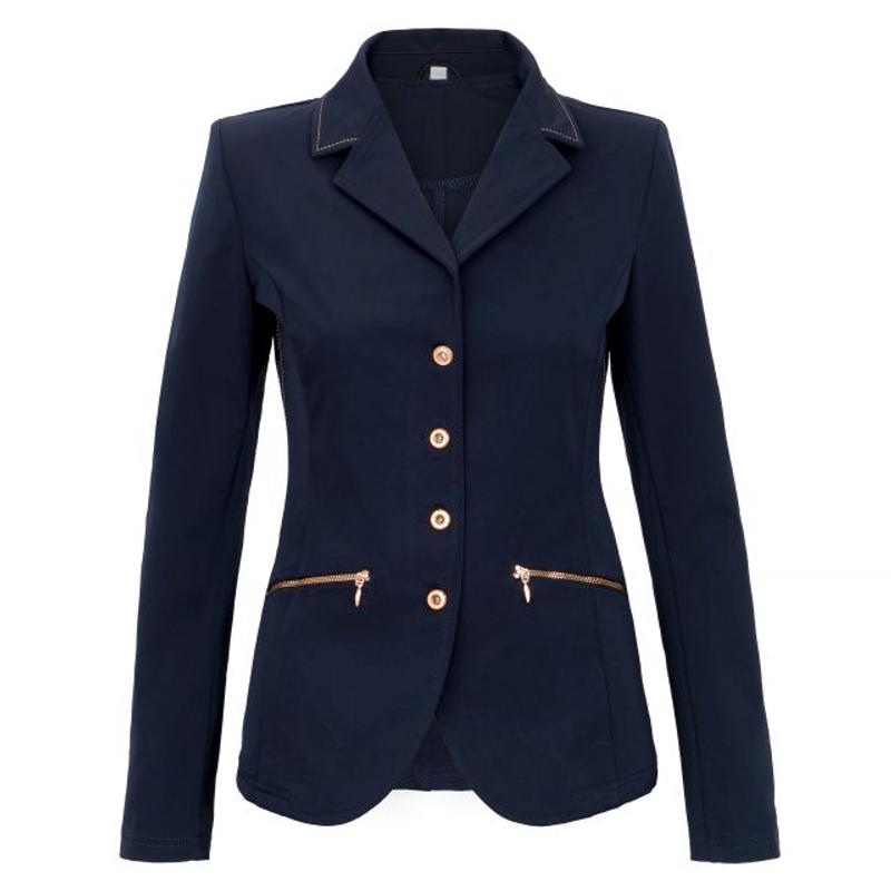 Frak młodzieżowy Zayla firmy Horze. Wykonany z elastycznego, lekkiego, oddychającego letniego materiału. Zapinany na trzy guziki i ozdobiony kryształowymi detalami na kieszeniach.Matreiał: 12% Nylon 85% Rayon 3% Elastan.