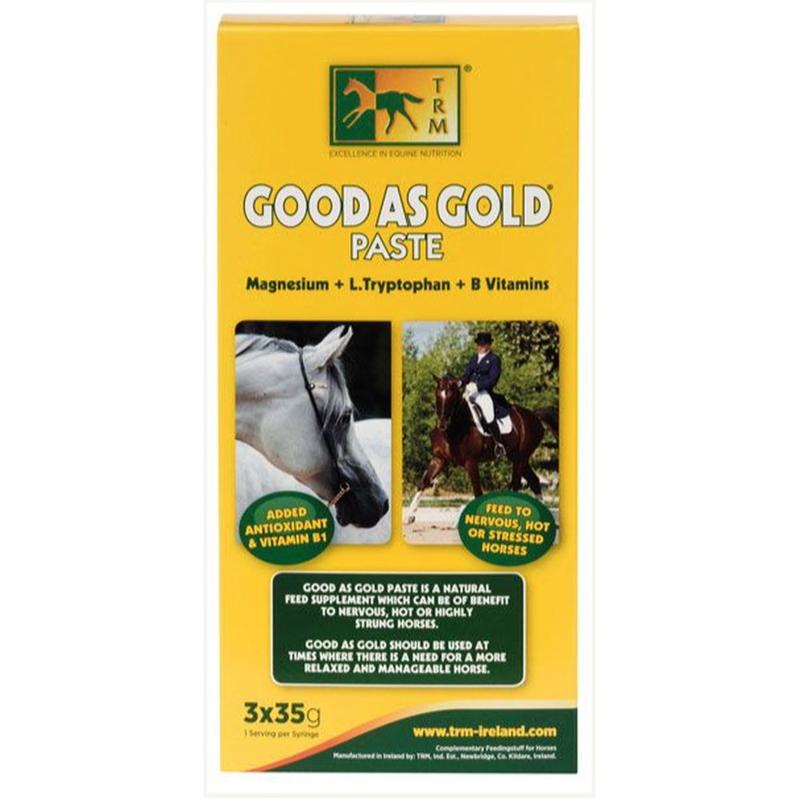TRM Good As Gold w paście to wygodny do aplikacji preparat dla nerwowych lub pobudliwych koni. Zawiera wysoki poziom chelatowanego magnezu, L-Tryptofanu (aminokwasu biorącego udział w powstawaniu serotoniny) oraz witamin z grupy B, które pełnią ważną funkcję w syntezie neurotransmiterów w centralnym układzie nerwowym.