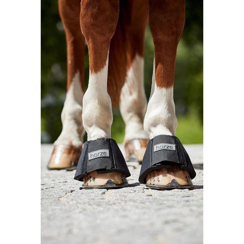 Kalosze gumowe z blokadą firmy Horze. Wykonane z wytrzymałej gumy, wyposażone w zapięcia na rzep. Kaloszki zaopatrzone w blokadę, która przeciwdziała obracaniu się wokół kopyt. Wkładamy tak aby blokada znajdowała się na piętce.