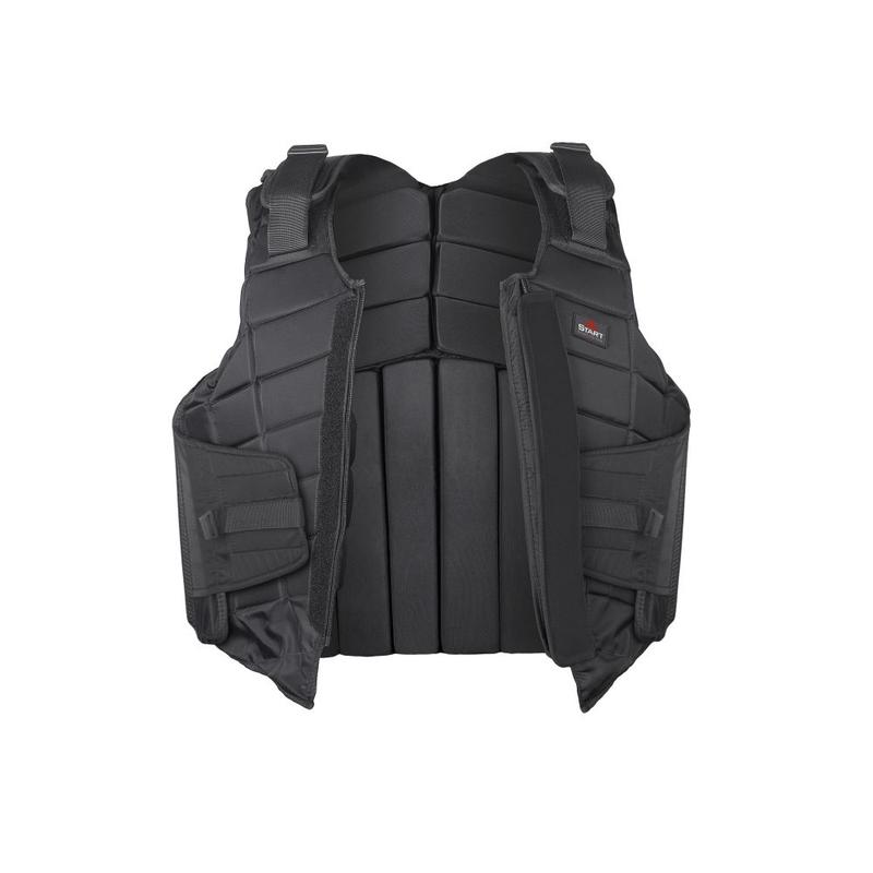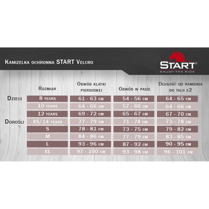 Kamizelka ochronna segmentowa, velctro firmy Start. Jej budowa zapewnia idealne dopasowanie się do ciała. Dodatkowo posiada odchylaną klapkę w celu ochrony kości ogonowej. Po bokach i na ramionach umieszczono regulację. Zgodna z atestem bezpieczeństwa: CE: EN 13158: 2009 poziom 3.