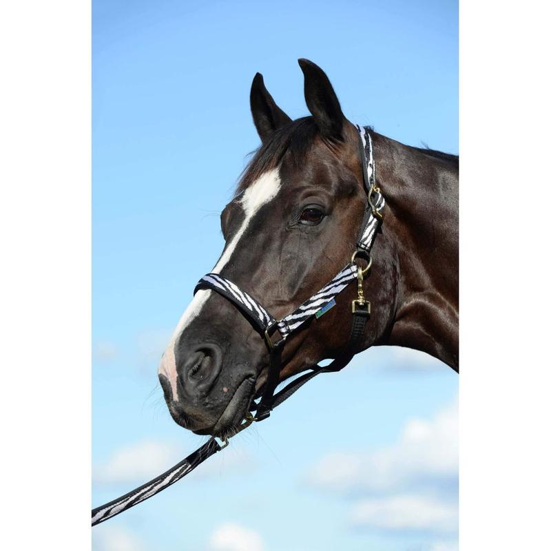 Wysokiej jakości kantar wykonany z podwójnej taśmy. Posiada miękkie podszycie na nachrapniku oraz potylicy. Regulowany na pasku potylicznym. Okucia w kolorze złotym.