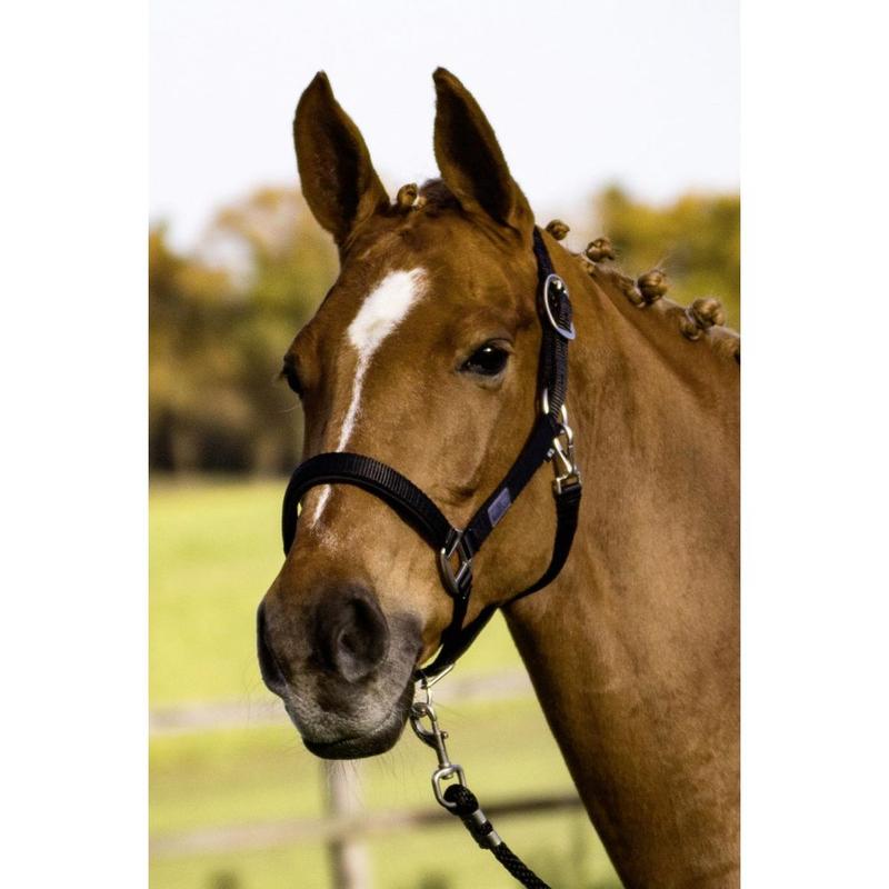 Kantar firmy Busse. Pasek nachrapnika regulowany po prawej stronie, dzięki czemu sprzączka nie przeszkadza podczas prowadzenia na uwiązie po lewej stronie.