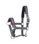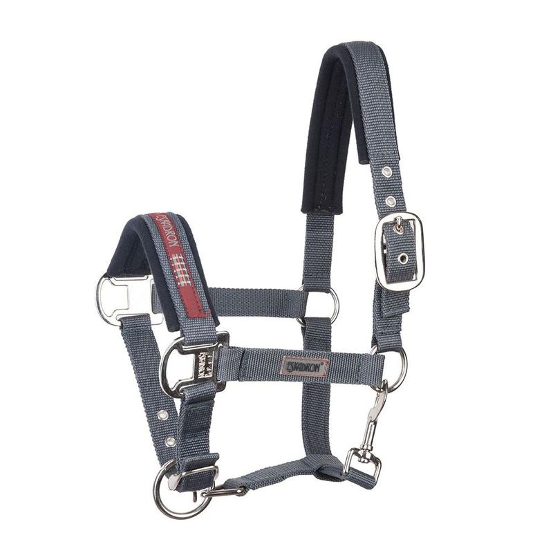 Standardowy kantar z kolekcji Eskadron wykonany z podwójnie obrabianej, zrywanej taśmy. Regulowany za pomocą antypoślizgowej klamry. Dodatkowo w delikatnych miejscach nosa i potylicy podszyty miękkim materiałem. Ozdobiony nowoczesną naszywką oraz napisem