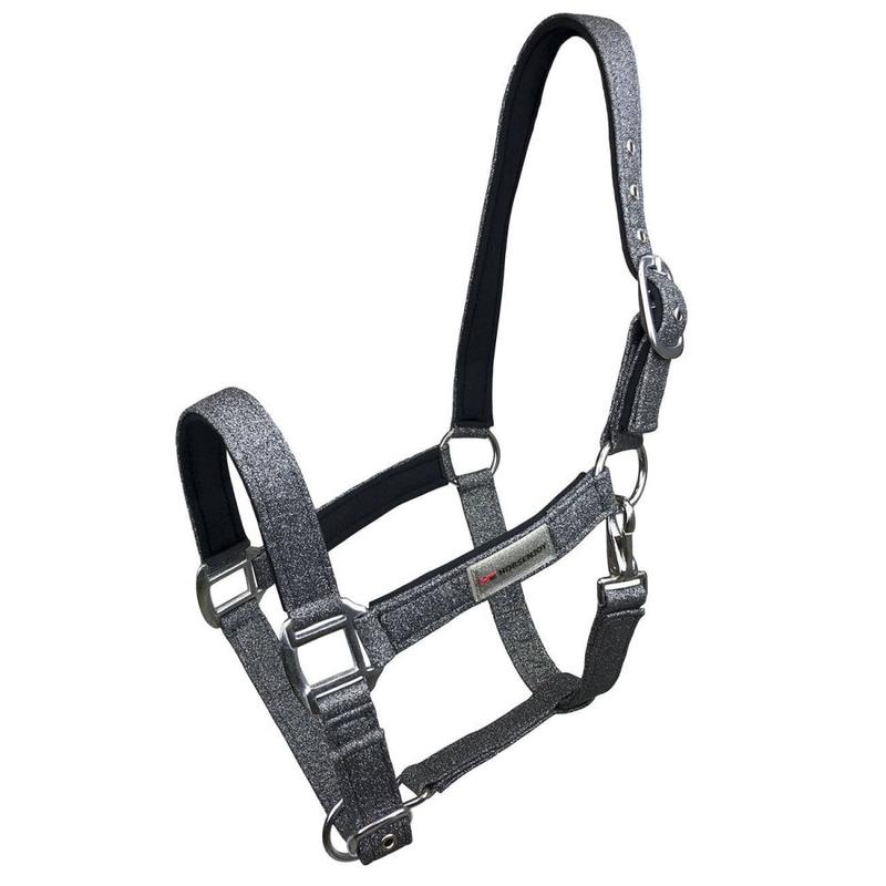 Niezwykle elegancki model kantara. Ozdobiony delikatną, brokatową taśmą. Paski policzkowe, nachrapnik oraz pasek potyliczny podszyte miękkim neoprenem. Posiada możliwość regulacji na pasku potylicznym oraz nachrapniku. Okucia w srebrnym kolorze.
