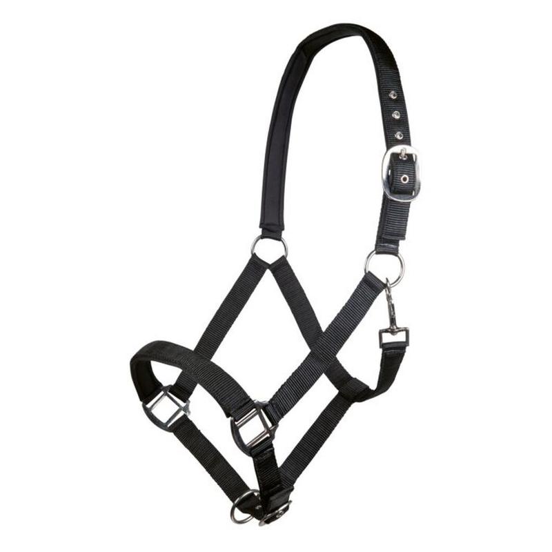 Kantar firmy HKM wykonany z mocnej, polipropylenowej taśmy. Nachrapnik i potylica miękko podszyte, co zapobiega otarciom. Posiada regulację rozmiaru w części potylicznej i nosowej, solidne sprzączki w kolorze srebrnym i zapinany na klasyczny karabińczyk.