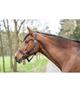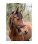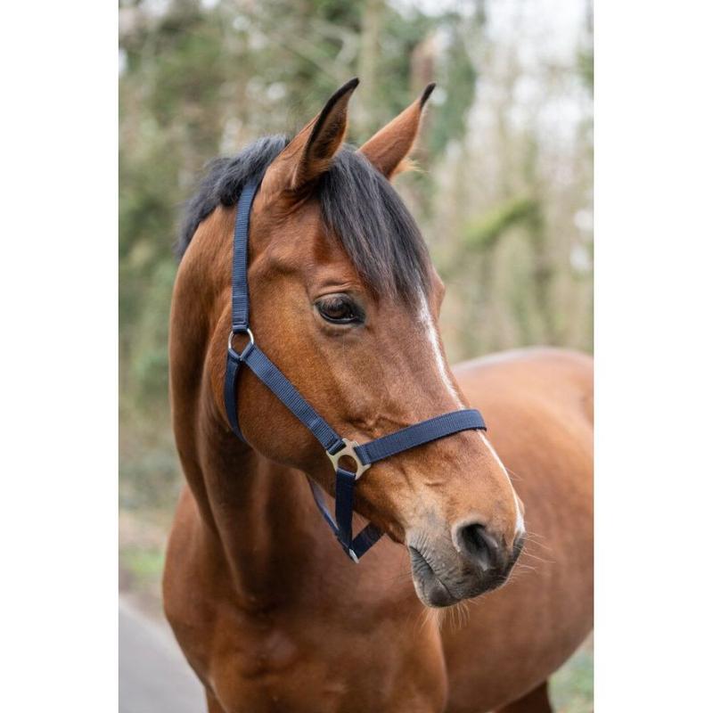 Kantar firmy HKM wykonany z wytrzymałej, odpornej na zerwanie podwójnej taśmy poliestrowej. Posiada regulacje rozmiaru w części potylicznej, okucia w kolorze srebrnym. Zapinany na zwykły karabińczyk.