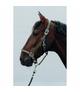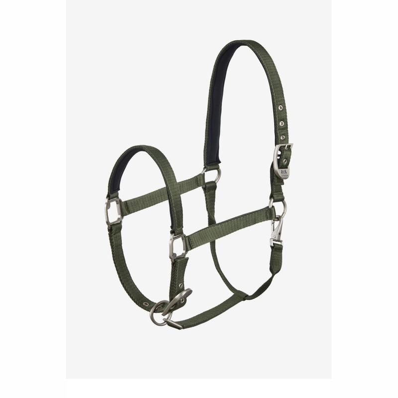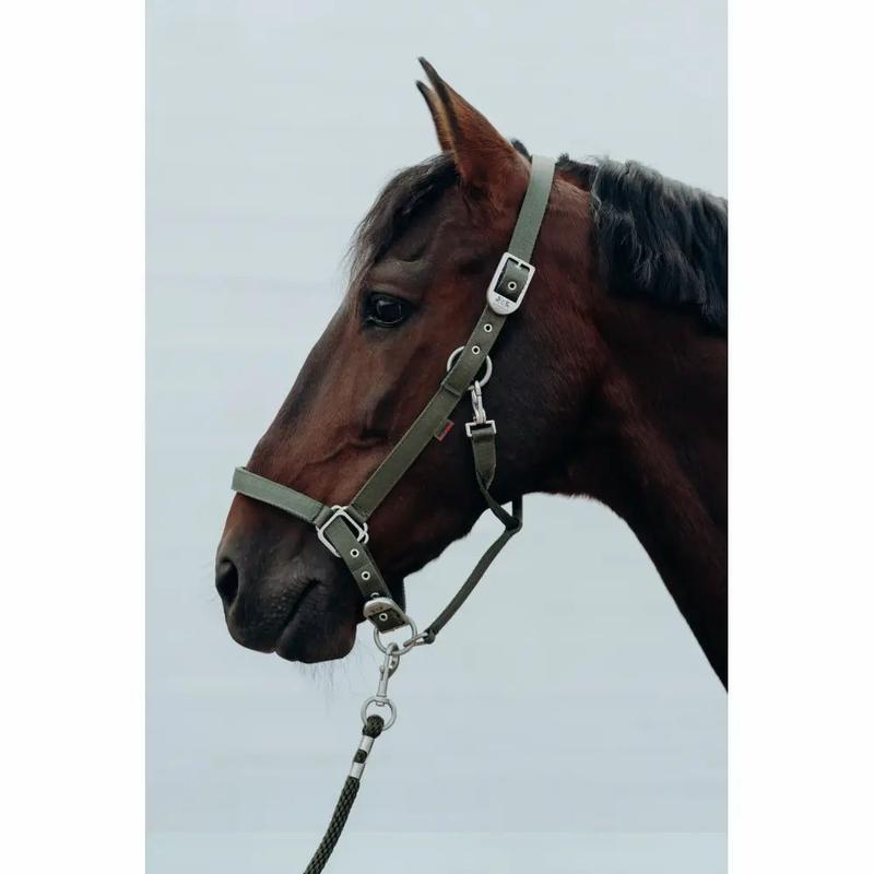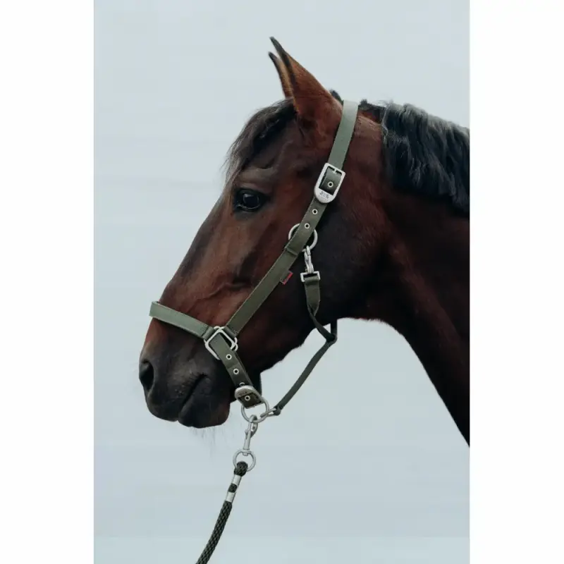Kantar łatwo się zapina na karabińczyk z boku, a satynowane sprzączki na pasku potylicznym i nachrapniku pozwalają na sprawną regulację rozmiaru.
