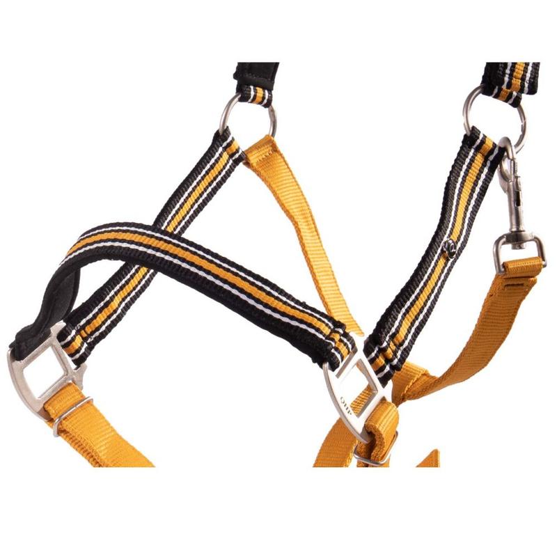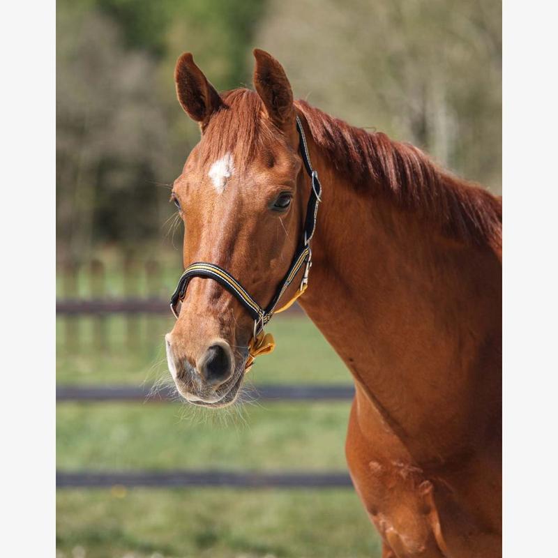 Kantar firmy QHP. Wykonany z wysokiej jakości taśmy nylonowej. Nachrapnik i potylica podszyte miękkim, gładkim neoprenem zapobiegającym otarciom. Podwójna regulacja rozmiaru umożliwia optymalne dopasowanie do głowy konia. Wytrzymałe, satynowe okucia z wygrawerowaną nazwą producenta. Zapinany na klasyczny karabińczyk.