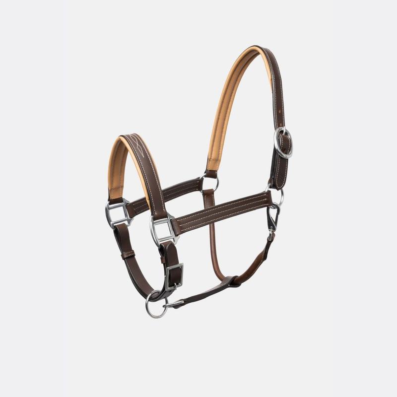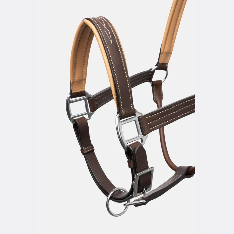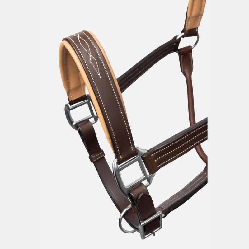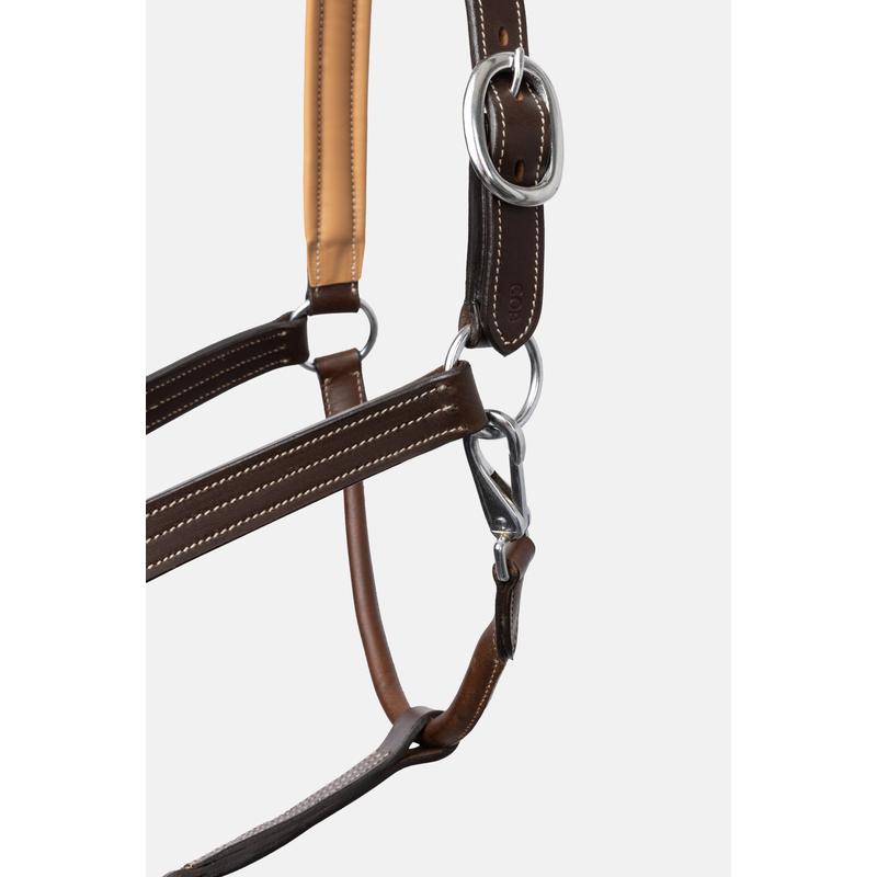 Skórzany kantar Gold firmy HKM. Posiada regulowany nachrapnik oraz część potyliczną regulowaną z obu stron, podszyty miękką skórą. Otwierany za pomocą karabińczyka i wyposażony w solidne sprzączki. Bardzo wytrzymały, odporny na niekorzystne warunki atmosferyczne.