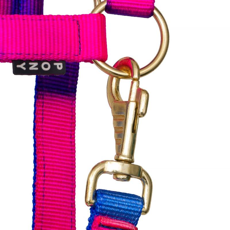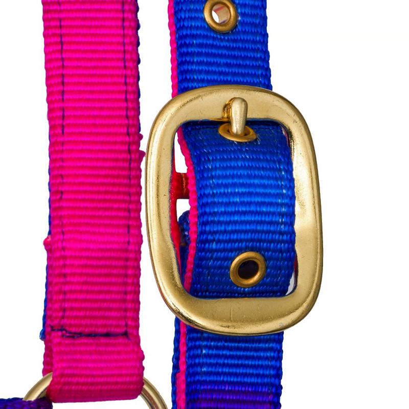 Obroża dla konia firmy Ekkia. Podwójnej grubości polipropylen ze skórzanymi szlufkami. Wyposażona w klamry mosiężne.