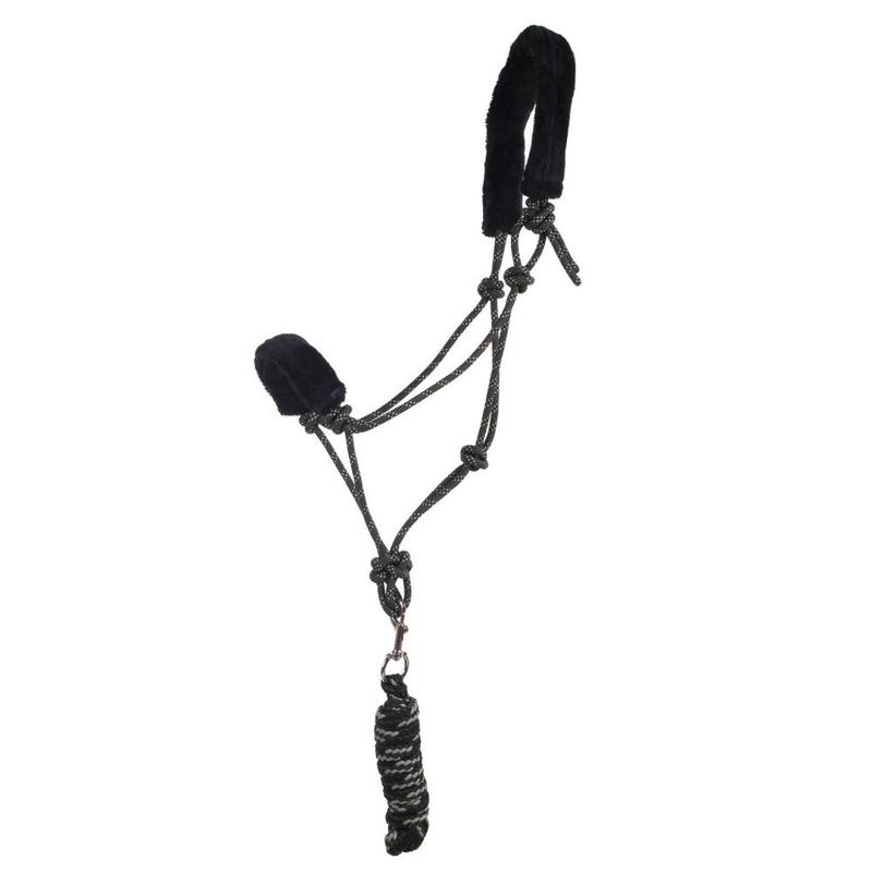 Kantar sznurowany firmy QHP. Wykonany z linki polipropylenowej. Nachrapnik i potylica obszyte miękkim, syntetycznym futerkiem. W komplecie z uwiązem z karabińczykiem typu snap.