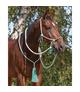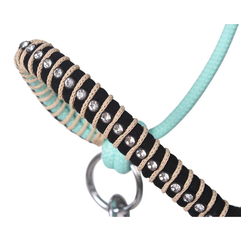 Kantar sznurkowy z wodzami Strass firmy HKM. Wykonany z wytrzymałej linki polipropylenowej. Część nosowa ozdobiona plecioną linką w kontrastujących kolorach. Istnieje duża możliwość regulacji.Wodze wykonane z grubej liny o specjalnym splocie.Zakończone sprzączkami.
