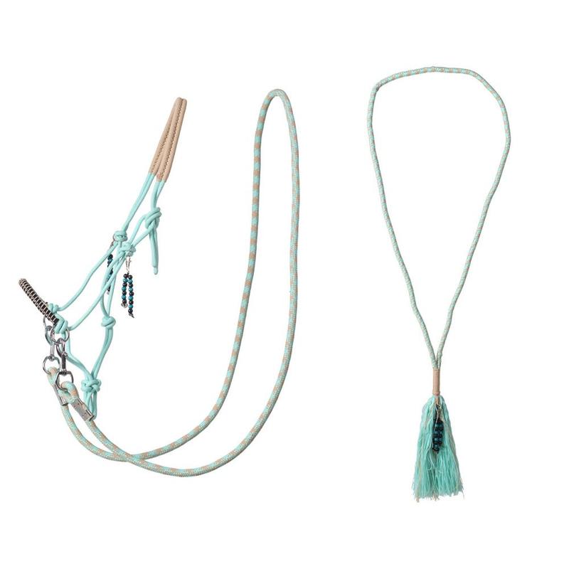 Kantar sznurowany Arizona firmy HKM. Wykonany z wytrzymałej linki polipropylenowej. Część nosowa ozdobiona plecioną linką w kontrastujących kolorach. Istnieje duża możliwość regulacji. W komplecie zawieszka do kluczy w stylu indiańskim.