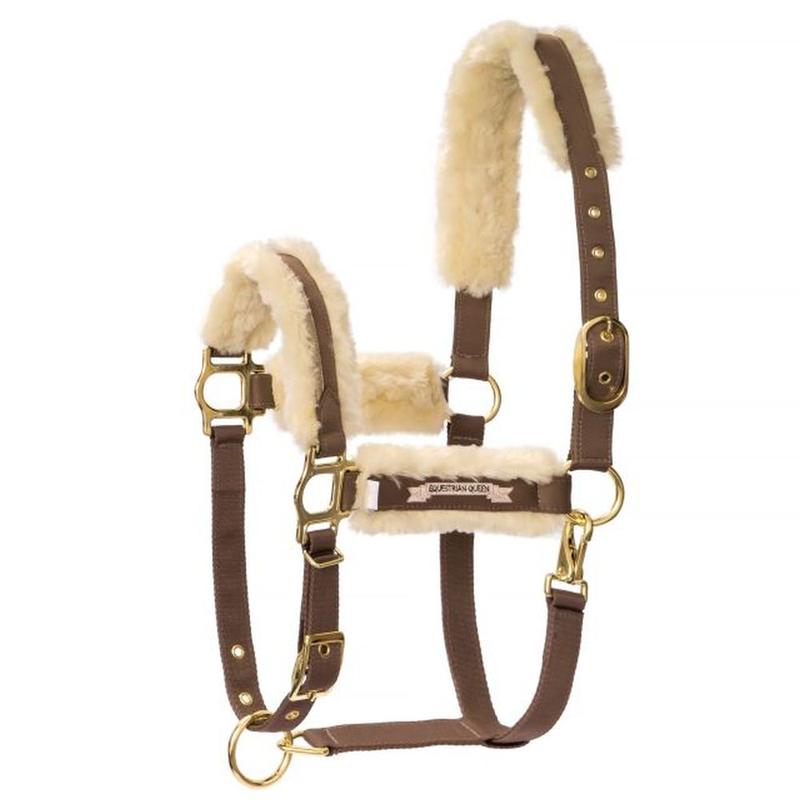 Futrzany kantar ozdobiony haftem Equestrian Queen i brokatową wstawką. Okucia z logo w kolorze złotym.